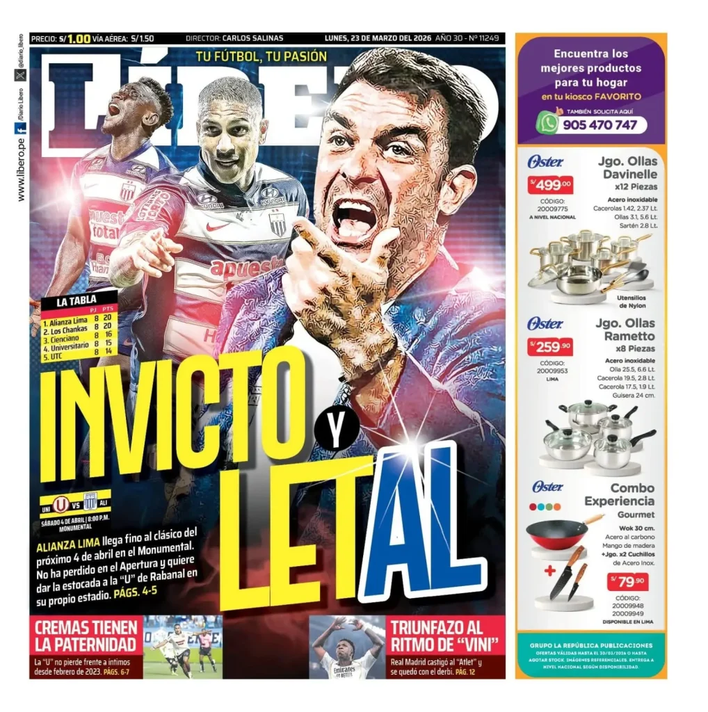 Alianza Lima es el tema con el cual abre también el diario Líbero, ponderando que los victorianos llegan triunfantes para el clásico en el estadio de los merengues. Esto como saldo de los seis partidos ganados y dos empatados que hasta el momento han conseguido en el Torneo Apertura. Algo que les permite estar cinco puntos por encima de Universitarrio de Deportes.