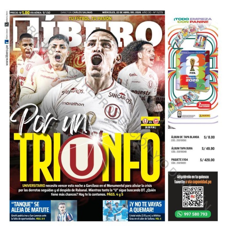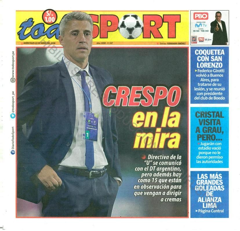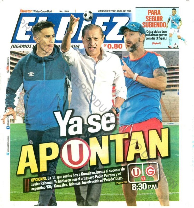 Las portadas de los diarios deportivos para hoy miércoles 22 de abril del 2026, informan sobre el momento de Universitario de Deportes. Y es que los cremas informaron en las últimas horas la destitución del español Javier Rabanal. Por medio de un comunicado dieron la noticia que era un secreto a voces.